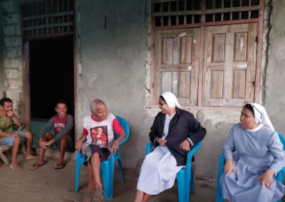 Più a est, a Nurobo, il ritmo è diverso. Qui il paesaggio si fa verde, punteggiato da palme e campi coltivati, con strade sterrate percorse da carretti e biciclette. Le famiglie vivono di agricoltura di sussistenza e piccole attività locali, spesso con risorse scarse e accesso limitato ai servizi. La comunità “Madre dei Dolori” ha scelto la strada più semplice: bussare alle porte, sedersi nelle case, ascoltare. Non solo consegnare, ma condividere: parole, preoccupazioni, sorrisi. Un modo per restituire il senso di appartenenza a chi, in contesti isolati, rischia di sentirsi dimenticato e solo.