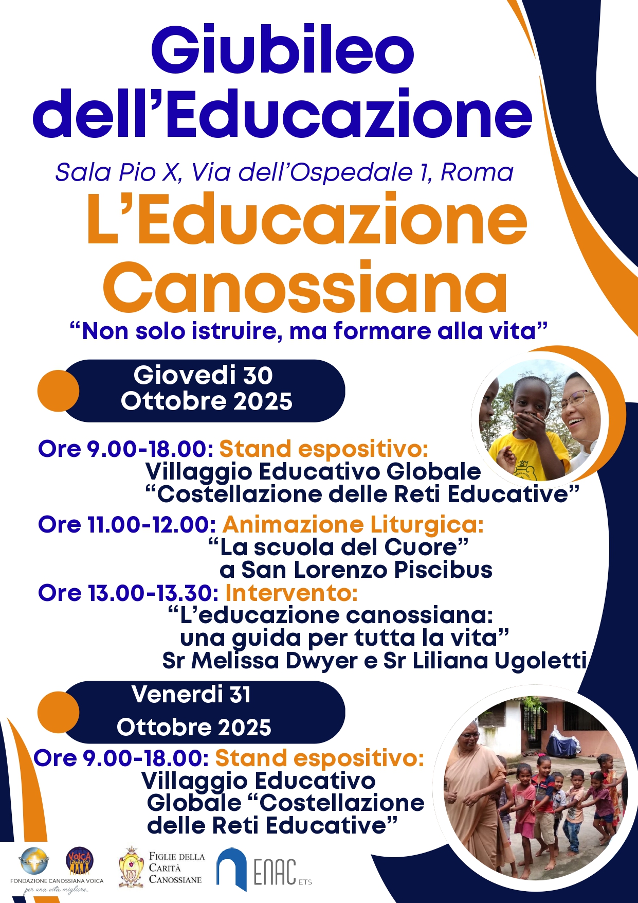 In the heart of Rome, on October 30–31, 2025, the Canossian Daughters of Charity will take part in the Jubilee of Education, held at Sala Pio X, Via dell’Ospedale 1.